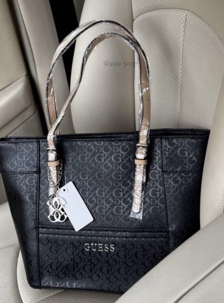حقيبة جيس لون اسود لمع خفيف حجم قاعدة 27 سم Guess Delaney Tote