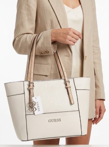 حقيبة جيس لون اوف وايت لمع خفيف حجم قاعدة 27 سم Guess Delaney Tote