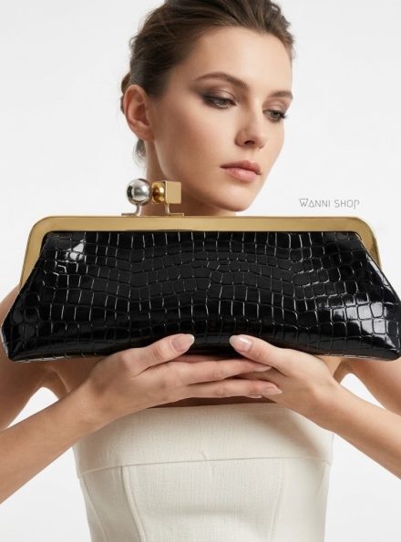 حقيبة كلاتش جاكيموس لون اسود جلد تمساح ماستر كواليتي | دوبل فيس جهة فضي و جهة ذهبي مع يد طويلة شامل العلبة Jacquemus La Pochette Salon