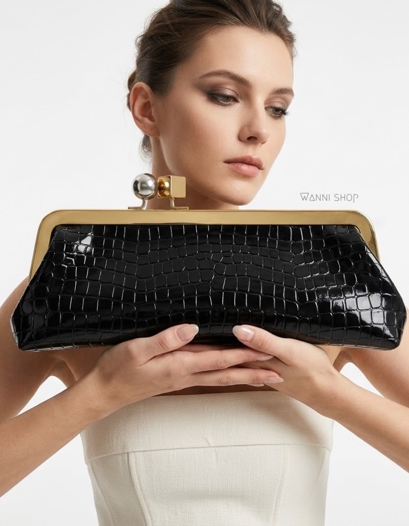 حقيبة كلاتش جاكيموس لون اسود جلد تمساح ماستر كواليتي | دوبل فيس جهة فضي و جهة ذهبي مع يد طويلة شامل العلبة Jacquemus La Pochette Salon